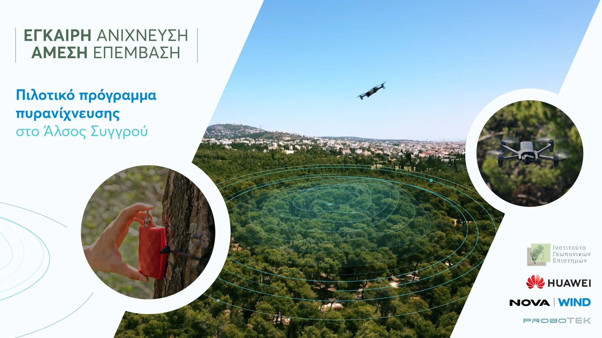 Η Huawei και η Nova – Wind μέλος της United Group, παρουσίασαν για πρώτη φορά στην Ελλάδα, ένα πιλοτικό πρόγραμμα πυρανίχνευσης, την Τετάρτη 29 Ιουνίου, στο Άλσος Συγγρού. Το συγκεκριμένο πρόγραμμα βασίζεται στην τεχνολογία 5G, καθώς και στη χρήση αλγορίθμων, τεχνητής νοημοσύνης και ρομποτικών drone. Το πρόγραμμα πυρανίχνευσης, είναι ένα σύστημα έγκαιρης προειδοποίησης αναγνώρισης ακραίων συμβάντων, όπως πυρκαγιές, με χρήση αισθητήρων και drone ώστε να αντιμετωπιστεί ένα πρόβλημα με κοινωνικές, περιβαλλοντικές και οικονομικές προεκτάσεις.
