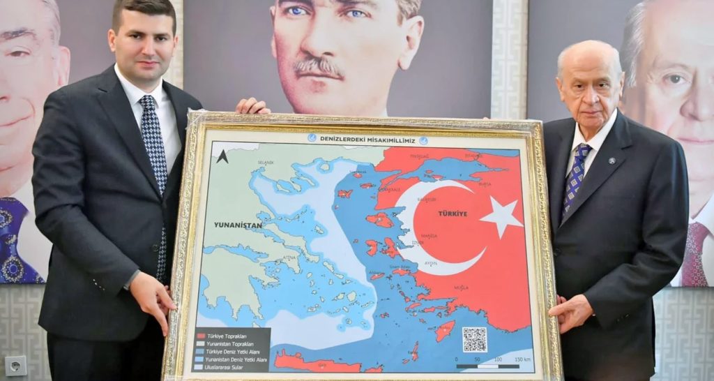 Ο Μάρτενς περιγράφει αναλυτικά τους χάρτες που παρουσίασε ο Ντεβλέτ Μπαχτστελί με ελληνικά νησιά, όπως τη Λέσβο, τη Χίο, την Κρήτη, και καμιά δεκαριά ακόμη, με το κόκκινο χρώμα της τουρκικής σημαίας επισημαίνοντας ότι πρόκειται για «ένα ξεκάθαρο μήνυμα, ειδικά από τη στιγμή που ο Μπαχτσελί είπε μόλις πριν από λίγες εβδομάδες ότι τα νησιά, που κάποτε ήταν μέρος της Οθωμανικής Αυτοκρατορίας, είχαν κλαπεί από την Τουρκία, οπότε πρέπει να της επιστραφούν ‘εθελοντικά ή με τη βία’. Αυτό που ανησυχεί είναι ότι ο Μπαχτσελί δεν είναι, όπως ίσως θα ήθελε κανείς, κάποιος εγκέφαλος της αντιπολίτευσης σε σύγχυση, αλλά ένας κυβερνητικός εταίρος και εκείνος που εξασφάλισε την κυβερνητική πλειοψηφία του προέδρου Ερντογάν που δεν αμφισβήτησε ποτέ τον μικρό κυβερνητικό εταίρο για την ρεβανσιστική του εμφάνιση, τουλάχιστον όχι δημόσια».