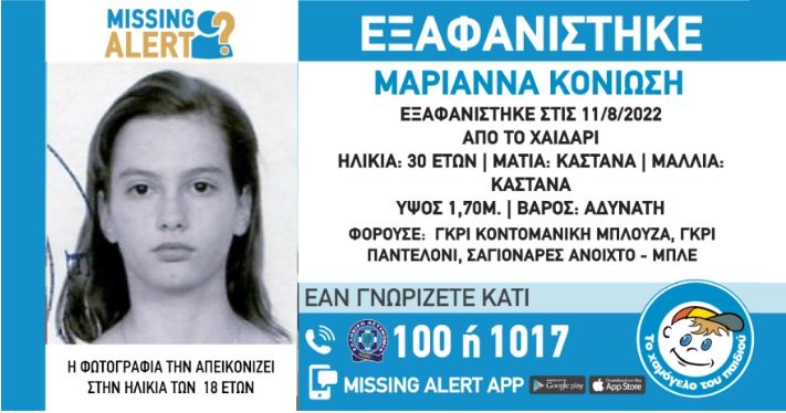 Σε συναγερμό βρίσκονται οι αρχές για τον εντοπισμό της 30χρονης, Κονιώση Μαριάννα, η οποία εξαφανίστηκε στις 11 Αυγούστου στην περιοχή του Χαϊδαρίου. Η Κονιώση Μαριάννα έχει ύψος 1,70 μ., είναι αδύνατη, έχει καστανά μαλλιά και καστανά μάτια. Φορούσε γκρι κοντομάνικη μπλούζα, γκρι παντελόνι και σαγιονάρες ανοιχτού μπλε.