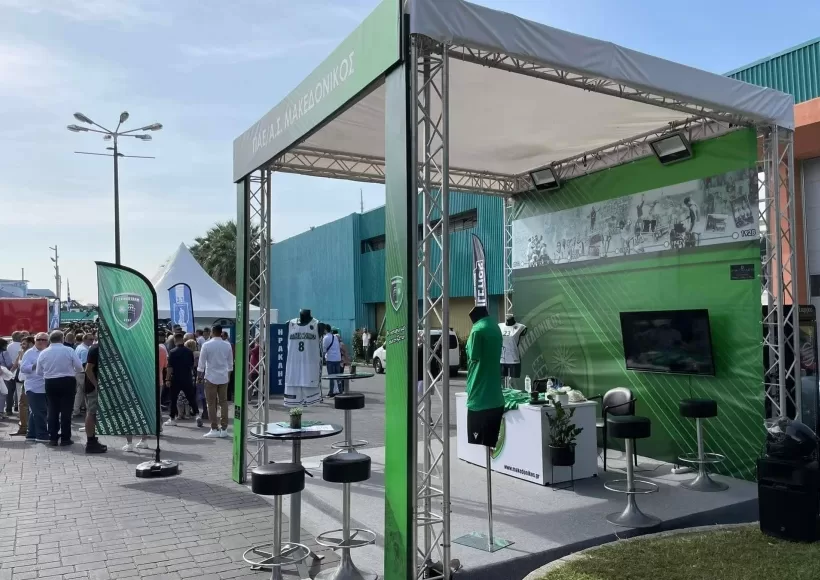 Ο κ. Τσίπρας με το επιτελείο του, αντίκρυσαν ένα άδειο περίπτερο, το οποίο κοσμούσαν οι φανέλες του Μακεδονικού, όπου απεικονίζεται η Μακεδονία με τα χρώματα της ελληνικής σημαίας.