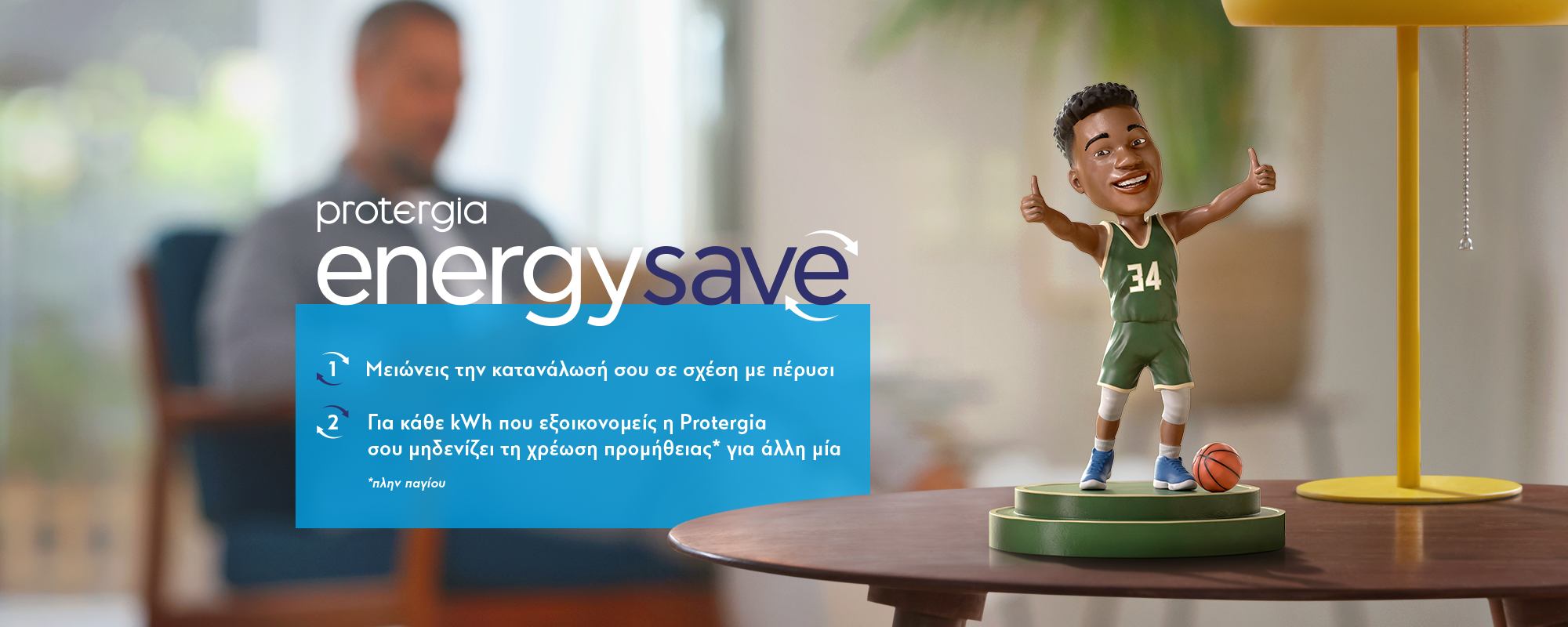Η ηλεκτρική ενέργεια είναι απαραίτητη για όλους, ωστόσο η σπατάλη της δεν είναι μόνο μια μη φιλική προς το περιβάλλον πρακτική, αλλά πλέον και δαπανηρή. To πρόγραμμα Protergia Energy Save απευθύνεται σε οικιακούς πελάτες που αλλάζουν την ενεργειακή τους συμπεριφορά και για αυτό επιβραβεύονται! Με τη μειωμένη ενέργεια που καταναλώνουν κερδίζουν διπλά, αφού για κάθε kWh που εξοικονομούν (σε σχέση με την αντίστοιχη περσινή περίοδο), η Protergia μηδενίζει τη χρέωση προμήθειας (πλην παγίου) για άλλη μία.