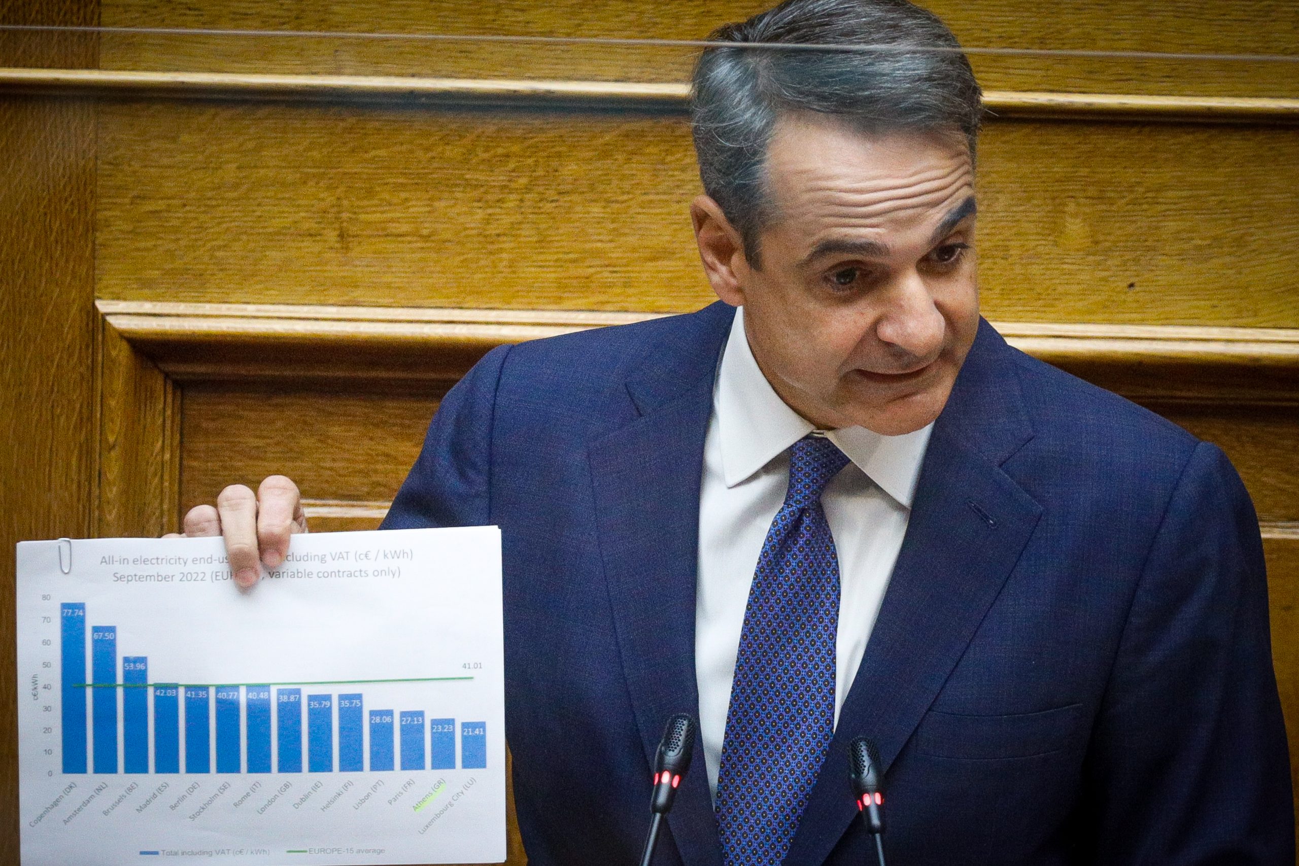 «Μίλησα για τρεις αυθαίρετους ισχυρισμούς του αρχηγού του ΣΥΡΙΖΑ παραχαράσσοντας τα στοιχεία για την Ελλάδα. Η χώρα μας δεν είναι ούτε πρώτη στον πληθωρισμό, ούτε πρώτη στην ενεργειακή ακρίβεια» ανάφερε ο πρωθυπουργός και συμπλήρωσε: «Η αλήθεια είναι πως ναι, η Ελλάδα έχει λίγο υψηλότερο πληθωρισμό, 12%, από τον ευρωπαϊκό μέσο όρο, αλλά υπάρχουν ουκ ολίγες χώρες άνω του 15%. Σε μία μεγάλη καταιγίδα η πατρίδα μας αμύνεται με τον καλύτερο δυνατό τρόπο. Με μέτρα και στήριξη του εισοδήματος. Μόνο για το 2022 η δέσμη στήριξης πλησιάζει τα 13 δις ευρώ. Μιλήσατε για την ενέργεια. παρουσιάσατε ότι η Ελλάδα έχει την ακριβότερη ενέργεια στην Ευρώπη. Να δούμε τα απόλυτα στοιχεία. Μαζί με ΦΠΑ, το Σεπτέμβριο του 2022, Αθήνα 23,23 σεντ ανά κιλοβατώρα. Μαδρίτη, 42 και το περιβόητο ιβηρικό μοντέλο το οποίο διαφημίζετε. Αυτές είναι οι πραγματικές τιμές τις οποίες πληρώνουν οι Έλληνες καταναλωτές. Σταματήστε τα ψέματα και την παραχάραξη της αλήθειας. Με τις επιδοτήσεις που δίνουμε το κόστος ενέργειας είναι αισθητά χαμηλότερο από τον ευρωπαϊκό μέσο όρο».
