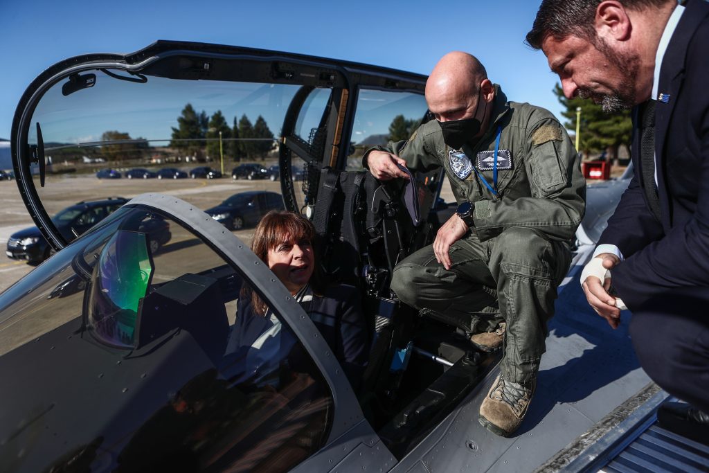 Η κ. Σακελλαροπούλου ενημερώθηκε για την αποστολή και το έργο της Μονάδας, μετέβη στην πίστα αεροσκαφών, όπου έγινε παρουσίαση των δυνατοτήτων των RAFALE και παρακολούθησε επίδειξη πτήσης τους στον εξομοιωτή.