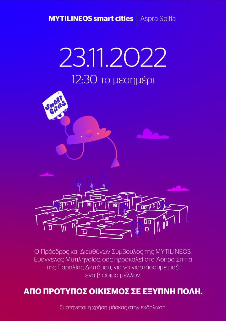 Η MYTILINEOS Smart Cities παρουσιάστηκε την Τετάρτη 23 Νοεμβρίου από τον Πρόεδρο & Διευθύνοντα Σύμβουλο της εταιρείας, Ευ. Μυτιληναίο, από τα νέα αναβαθμισμένα πια Άσπρα Σπίτια: «Οραματιζόμαστε όχι απλώς να κάνουμε πιο έξυπνες τις πόλεις μας, αλλά να τις κάνουμε πιο φιλικές, «πράσινες» και βιώσιμες. Ταυτόχρονα ευελπιστούμε να κάνουμε πιο εύκολη την καθημερινότητα των πολιτών και των κατοίκων, σε μια κρίσιμη στιγμή για την ανθρωπότητα» δήλωσε.