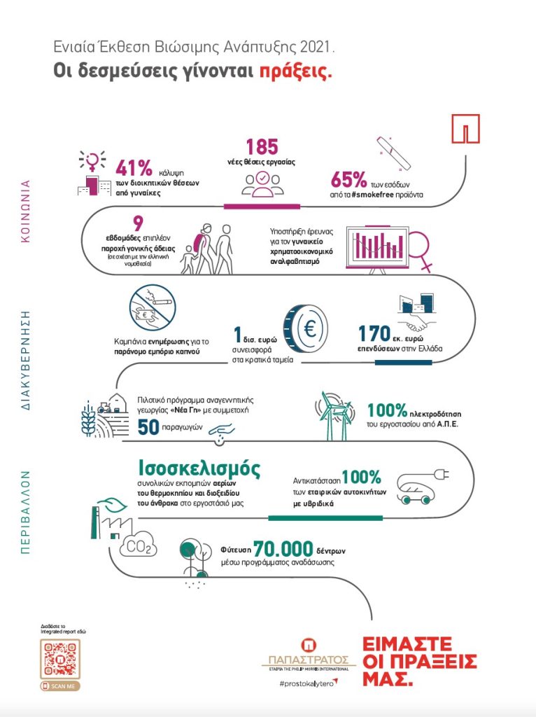 Λειτουργώντας με διαφάνεια και υπευθυνότητα, μέσα από τη 2η Ενιαία Έκθεση Βιώσιμης Ανάπτυξης, η Παπαστράτος στοχεύει στην αναλυτική αποτύπωση – με σαφείς και μετρήσιμους στόχους υλοποίησης και δείκτες απόδοσης (KPIs) – των επιδόσεων της επιχειρηματικής στρατηγικής και λειτουργίας της σε θέματα Περιβάλλοντος, Κοινωνίας και Εταιρικής Διακυβέρνησης (ESG).