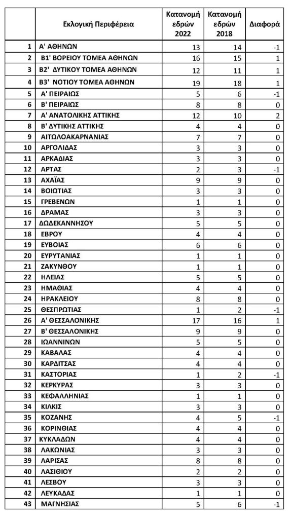 Ακολουθεί ο πίνακας με την κατανομή των εδρών που διαμορφώνει τον νέο εκλογικό χάρτη της χώρας για την επόμενη εκλογική διαδικασία.