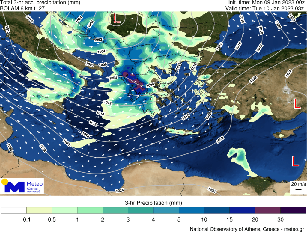 Αύριο Τρίτη (10/1), ισχυρές βροχές και καταιγίδες προβλέπονται να εκδηλωθούν τις πρωινές ώρες στην Ήπειρο, μέχρι το μεσημέρι στο Ιόνιο, τη δυτική Στερεά και τη δυτική Πελοπόννησο, από τις προμεσημβρινές μέχρι και τις βραδινές ώρες στη Θράκη, την ανατολική Μακεδονία και τα νησιά του βορείου και ανατολικού Αιγαίου και από τις απογευματινές ώρες στα Δωδεκάνησα. Τα ισχυρά φαινόμενα το μεσημέρι-απόγευμα πρόσκαιρα θα επηρεάσουν τις Κυκλάδες και την Κρήτη. Θυελλώδεις δυτικοί άνεμοι εντάσεως 8 μποφόρ θα επικρατήσουν στο Ιόνιο και νότιοι νοτιοδυτικοί εντάσεως 8 τοπικά 9 μποφόρ στο Αιγαίο. Χιονοπτώσεις θα σημειωθούν στα ορεινά της ηπειρωτικής χώρας.