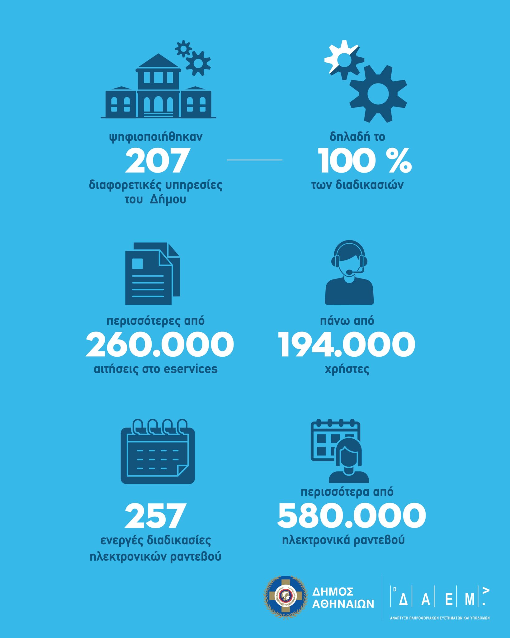 Οι δημότες και οι επαγγελματίες της Αθήνας, απολαμβάνουν πλέον, από την αρχή του έτους, μια γρήγορη και αποτελεσματική εξυπηρέτησή σε οποιαδήποτε συναλλαγή τους με τον Δήμο Αθηναίων,μετά την ολοκλήρωση του έργου της ψηφιοποίησης των υπηρεσιών του δήμου. Πρόκειται για την επίτευξη ενός φιλόδοξου στόχου που έθεσε εξαρχής η δημοτική αρχή της Αθήνας, με την προσωπική δέσμευση του Δημάρχου Αθηναίων, Κώστα Μπακογιάννη για ψηφιοποίηση του συνόλου των υπηρεσιών έως το τέλος του 2022, όπως αναφέρεται σε σχετική ανακοίνωση.