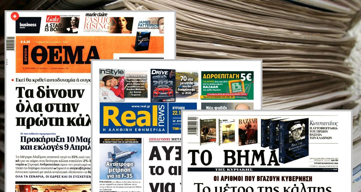 Κοινοποίηση Facebook Twitter LinkedIn Pinterest Email Copy Link Διαβάστε τα πρωτοσέλιδα των σημερινών εφημερίδων κυριακάτικες εφημερίδες Πρωτοσέλιδα