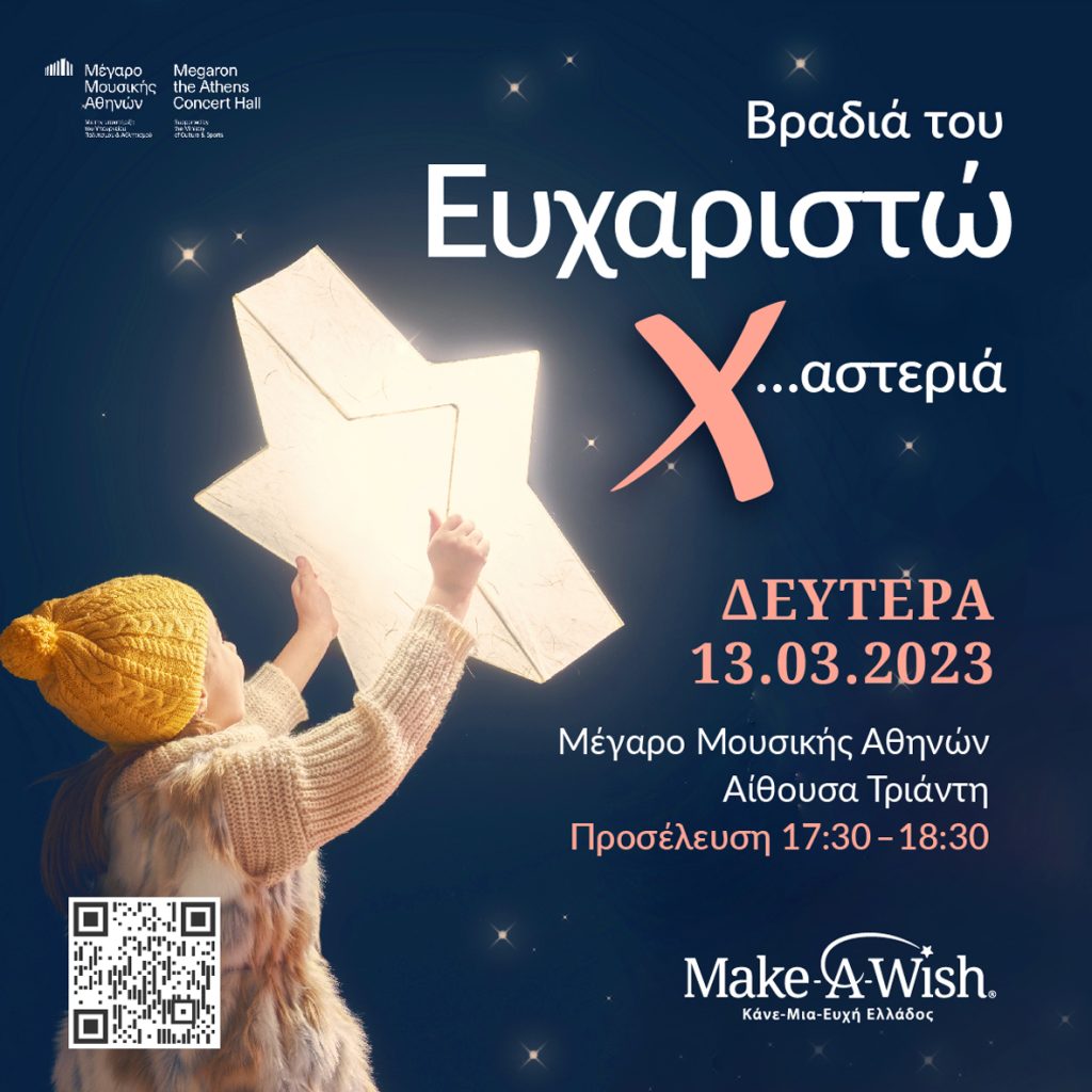 To Make-A-Wish (Κάνε-Μια-Ευχή Ελλάδος) σάς καλεί στην ετήσια Βραδιά του Ευχαριστώ. Φέτος, η εκδήλωση την οποία παρακολουθούν πάνω από 1.000 φίλοι του οργανισμού, θα έχει θέμα την “X…αστεριά”. Πλήθος γονέων και παιδιών θα μοιραστούν τις δικές τους ιστορίες και θα μας δώσουν μία «νότα»… ΑΣΤΕΡΩΝ!