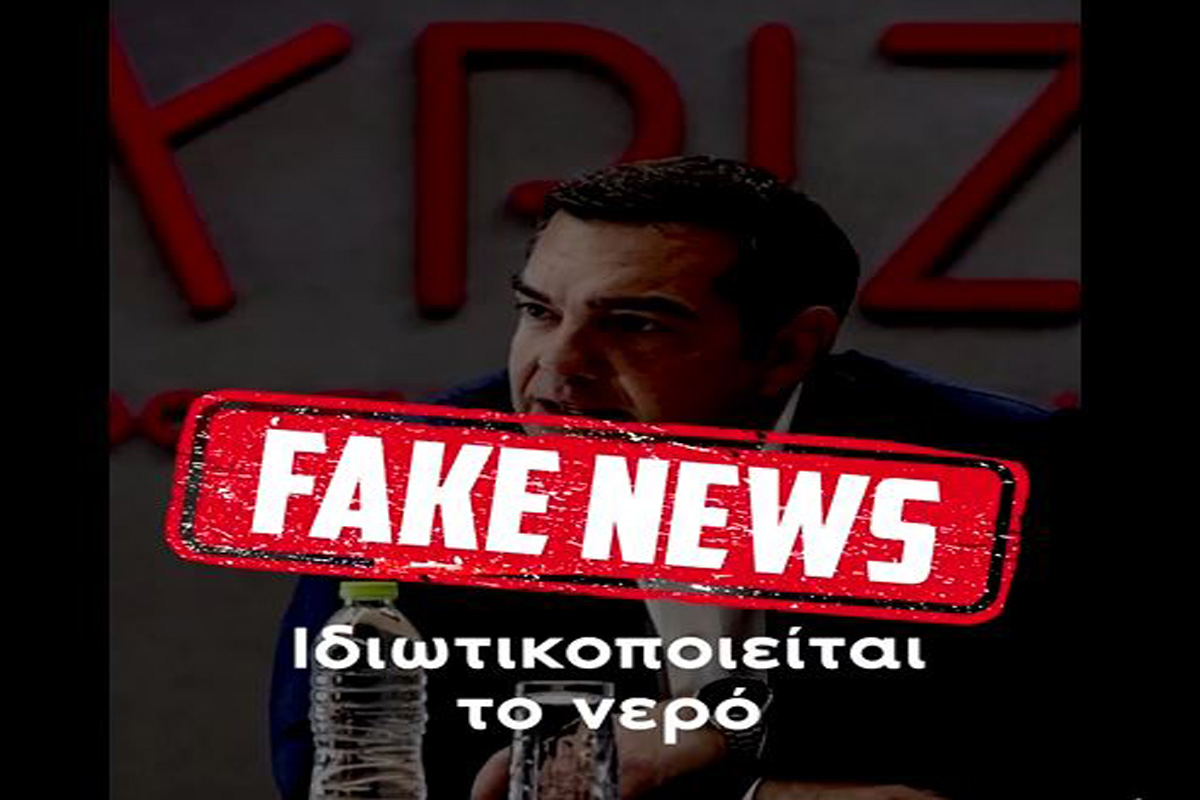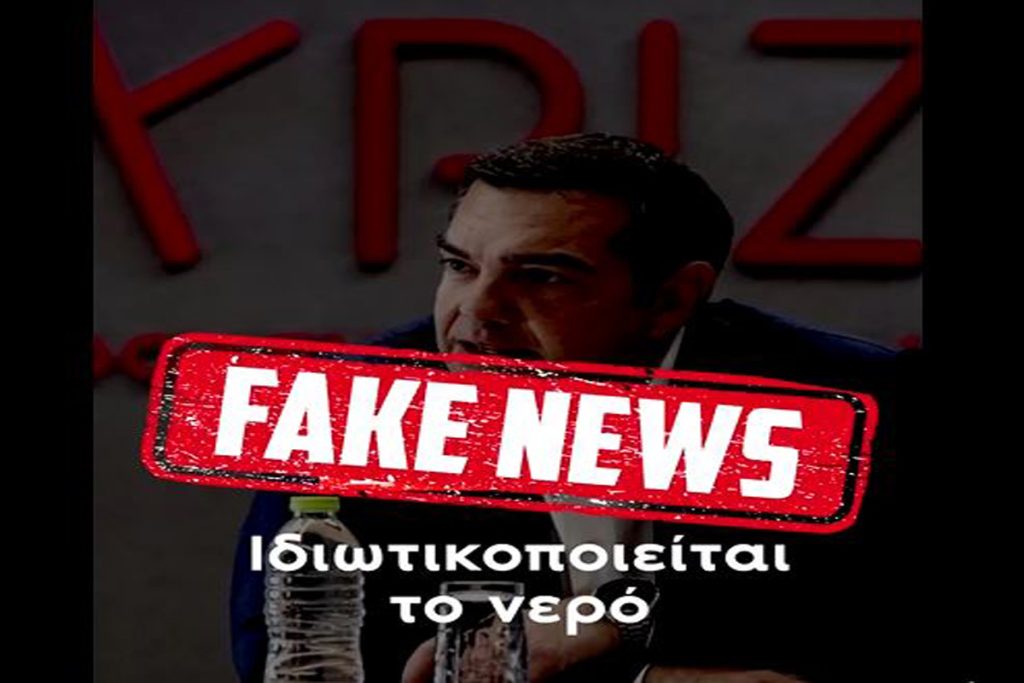 Το παρατηρητήριο fake news της ΝΔ αναφέρεται στα «fake news του ΣΥΡΙΖΑ για την ”ιδιωτικοποίηση του νερού”». Συγκεκριμένα απαντά στις αιτιάσεις του ΣΥΡΙΖΑ ότι η κυβέρνηση ιδιωτικοποιεί το νερό, ότι ο Κυριάκος Μητσοτάκης είχε προαναγγείλει την ιδιωτικοποίηση του νερού, ότι η κυβέρνηση Τσίπρα διασφάλισε τον δημόσιο χαρακτήρα του νερού και ότι η ρύθμιση που έφερε η κυβέρνηση ανοίγει την πόρτα της ιδιωτικοποίησης.