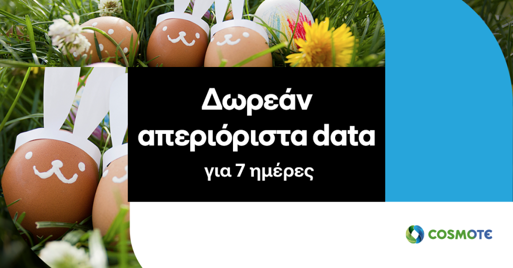 Δωρεάν απεριόριστα data για 7 ημέρες προσφέρει φέτος το Πάσχα σε όλους τους συνδρομητές της η COSMOTE, για να μπορούν να σερφάρουν ξένοιαστα και να μοιράζονται online τις αγαπημένες τους γιορτινές στιγμές με τους φίλους τους. Όπως κάθε χρόνο, έτσι και φέτος το Πάσχα, που οι ανάγκες για data είναι μεγαλύτερες, η COSMOTE απελευθερώνει την εμπειρία του Internet στο κινητό. Η προσφορά διατίθεται έως και την Δευτέρα του Πάσχα, 17 Απριλίου, για όλους τους οικιακούς και εταιρικούς πελάτες κινητής COSMOTE.