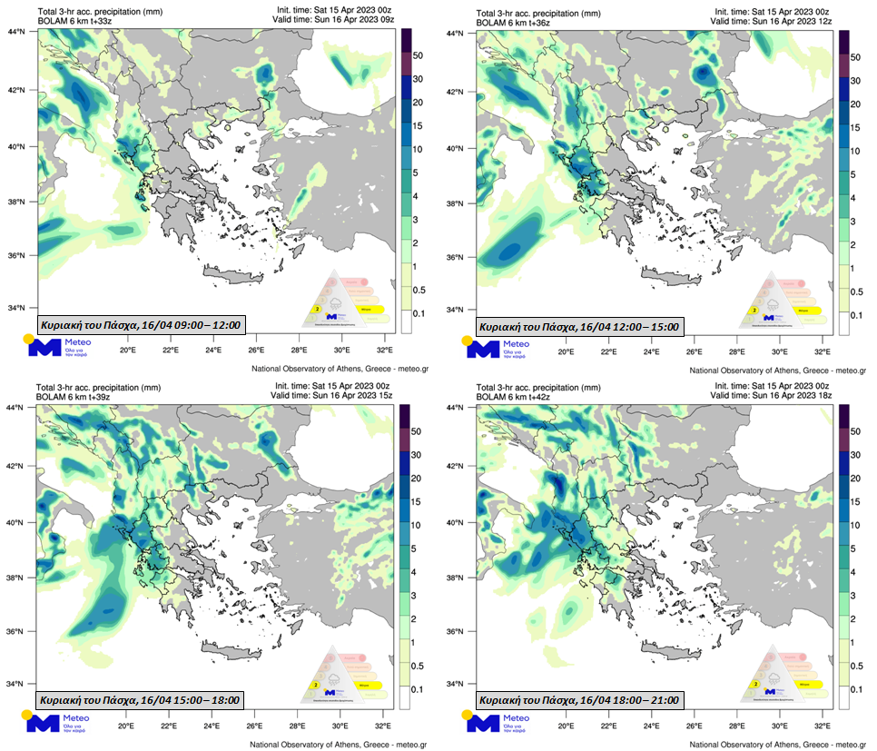 Στους χάρτες που ακολουθούν παρουσιάζεται η βροχή που αναμένεται ανά τρίωρο από το πρωί έως το απόγευμα της Κυριακής του Πάσχα