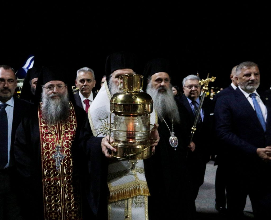 Σε κλίμα κατάνυξης έφθασε στο αεροδρόμιο «Ελευθέριος Βενιζέλος» το αεροσκάφος της AEGEAN που μετέφερε το ‘Αγιο Φως από το Ιεροσόλυμα.