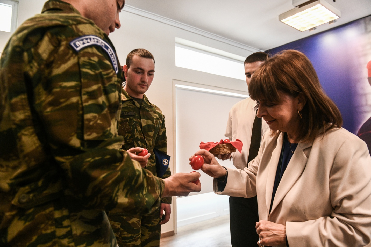 Η Κατερίνα Σακελλαροπούλου αντάλλαξε ευχές με τους Εύζωνες και τα στελέχη της Προεδρικής Φρουράς για τις άγιες ημέρες του Πάσχα και τσούγκρισε μαζί τους το παραδοσιακό κόκκινο αυγό.