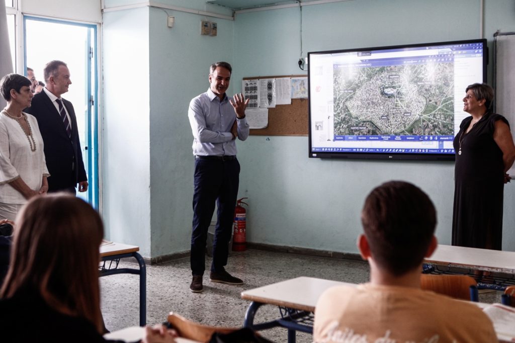 Πρώτος σταθμός της περιοδείας του Κυριάκου Μητσοτάκη στον Πειραιά ήταν το 1ο Γυμνάσιο και το 1ο Λύκειο, με τον πρωθυπουργό να παρακολουθεί την παράδοση των μαθημάτων της Ιστορίας, της Βιολογίας και της Γεωγραφίας στον διαδραστικό πίνακα.