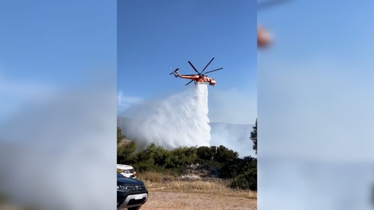 Σύμφωνα με την Πυροσβεστική η φωτιά καίει χαμηλή βλάστηση και μέχρι στιγμής δεν κινδυνεύουν σπίτια.