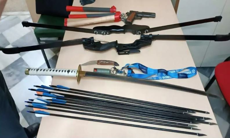 Στην κατοχή του 49χρονου και στο σπίτι του βρέθηκαν και κατασχέθηκαν, μία απομίμηση όπλου, ένα ξίφος μήκους λάμας 70 εκατοστών, ένας σουγιάς μήκους λάμας 10 εκατοστών, δύο τόξα, μία φαρέτρα με 10 βέλη, δύο ζευγάρια κρόταλα και δύο σπρέι πιπεριού.
