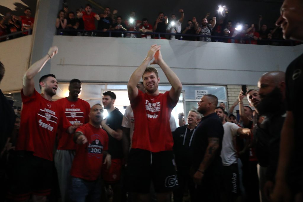 Οι πανηγυρισμοί των παικτών του Ολυμπιακού συνεχίστηκαν και στο ΣΕΦ, εκεί οπου οι οπαδοί της ομάδας είχαν στήσει το δικό τους… πάρτι.