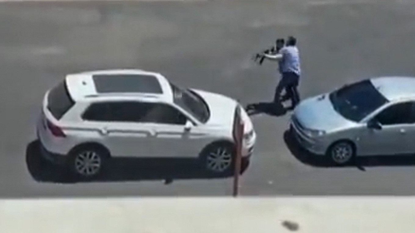 Στο βίντεο που καταγράφηκε από κινητό, φαίνεται ο 25χρονος να έχει σταματήσει το αυτοκίνητό του μπροστά στο όχημα που οδηγούσε η πρώην σύζυγός του και να παλεύει με τον πατέρα της ο οποίος προσπαθεί να του πάρει από τα χέρια το Καλάσνικοφ που κρατούσε.