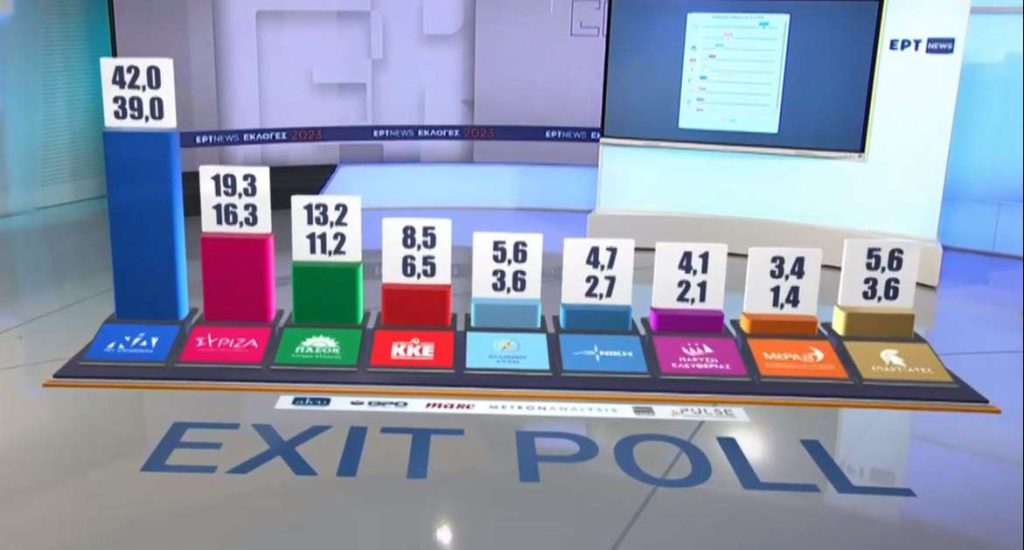 Επιβεβαιώνεται η θριαμβευτική επικράτηση της ΝΔ με ισχυρή αυτοδυναμία δείχνει το κοινό exit poll των τηλεοπτικών σταθμών εθνικής εμβέλειας που μεταδόθηκε λίγο πριν τις 8 μ.μ. (στο 100% των exit poll).