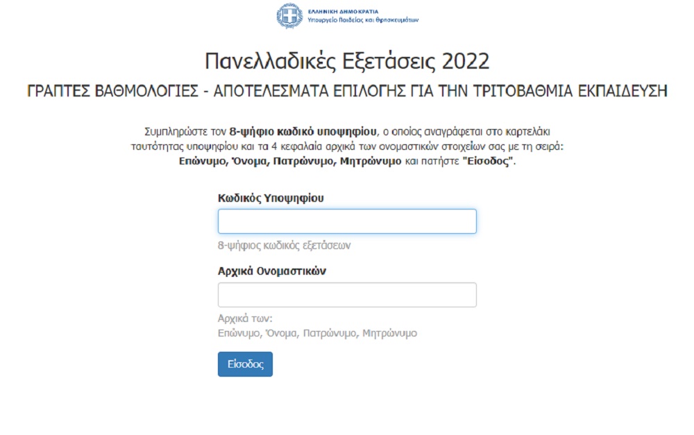 Επιπλέον, όλοι οι υποψήφιοι θα μπορούν να αναζητούν τη βαθμολογία τους στην ιστοσελίδα https://results.it.minedu.gov.gr, πληκτρολογώντας τον οκταψήφιο κωδικό τους και τους τέσσερις αρχικούς χαρακτήρες από το επώνυμο, το όνομα, το πατρώνυμο και το μητρώνυμό τους με κεφαλαίους χαρακτήρες.