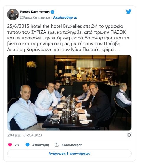 Με μία ανάρτηση στο Twitter ο Πάνος Καμμένος απαντά στον ΣΥΡΙΖΑ, ο οποίος με ανακοίνωσή του σχολίασε τη συνέντευξη του άλλοτε κυβερνητικού εταίρου στην κυβέρνηση του 2015-2019 στον ΑΝΤ1. Πιο συγκεκριμένα, ο Πάνος Καμμένος δημοσίευσε στο Twitter μια φωτογραφία στην οποία εμφανίζεται ο ίδιος στο εστιατόριο «The Restaurant by Pierre Balthazar», με τον Αλέξη Τσίπρα, τον Νίκο Παππά και τον Γαβριήλ Σακελλαρίδη.