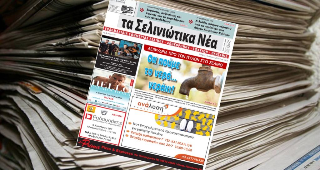 Κυκλοφόρησε το νέο φύλλο της εβδομαδιαίας τοπικής εφημερίδας της Κρήτης “Σελινιώτικα Νέα”.