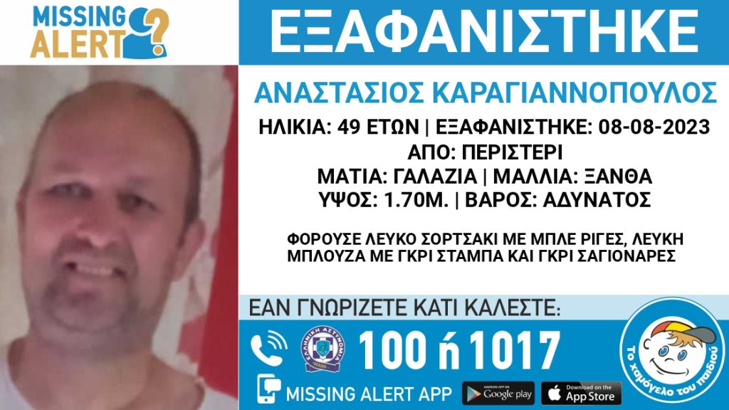 Στις 8 Αυγούστου 2023, απογευματινές ώρες, εξαφανίστηκε από την περιοχή του Περιστερίου ο Καραγιαννόπουλος Αναστάσιος, 49 ετών. Το «Χαμόγελο του Παιδιού» ενημερώθηκε σήμερα 10/08/2023 για την εξαφάνιση του Καραγιαννόπουλου Αναστάσιου και προχώρησε στη δημοσιοποίηση των στοιχείων του ενήλικα κατόπιν αιτήματος της οικογένειας του, καθώς ενδέχεται να συντρέχουν σοβαροί λόγοι οι οποίοι θέτουν τη ζωή του σε κίνδυνο. Ο Καραγιαννόπουλος Αναστάσιος έχει ύψος 1,70 μ., είναι αδύνατος, έχει ξανθά μαλλιά και γαλάζια μάτια. Φορούσε λευκό σορτσάκι με μπλε ρίγες, λευκή μπλούζα με γκρι στάμπα και γκρι σαγιονάρες.