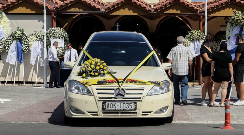 Το φέρετρο ήταν στολισμένο με κίτρινα τριαντάφυλλα και ένα κασκόλ της ΑΕΚ που γράφει Original.