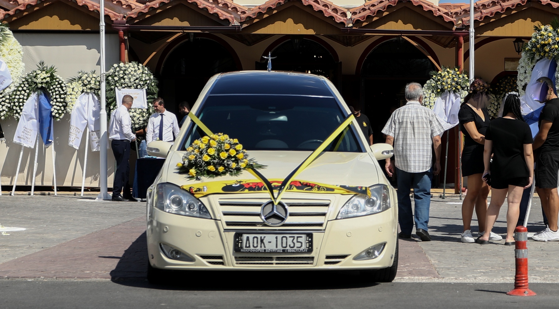 Με κίτρινα λουλούδια στα χέρια οι φίλοι της ΑΕΚ αποχαιρετούν τον 29χρονο Μιχάλη στην εκκλησία του Αγίου Κωνσταντίνου στην Ελευσίνα.