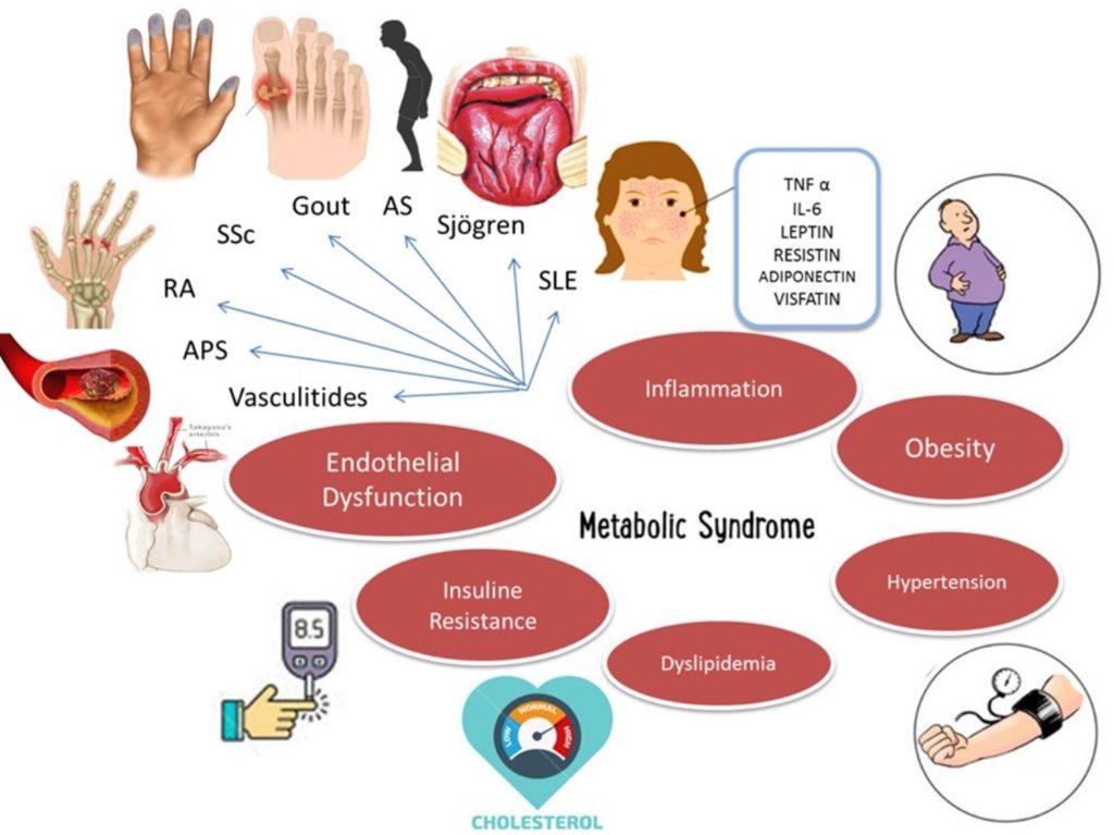 Οι αδιποκίνες (λεπτίνη κ.ά.) είναι ουσίες, που ασκούν ποικιλία μεταβολικών δραστηριοτήτων στο Μεταβολικό Σύνδρομο και εμπλέκονται στη ρύθμιση τόσο των φλεγμονωδών διεργασιών όσο και της αυτοανοσίας που εμφανίζονται σε Αυτοάνοσες Ρευματικές Παθήσεις. Ασθενείς με αυτοφλεγμονώδη νοσήματα -όπως η ουρική αρθρίτιδα- και εκείνοι με Αυτοάνοσα Ρευματικά Νοσήματα (A.Ρ.Ν), όπως ο Συστηματικός Ερυθηματώδης Λύκος, η Ρευματοειδής Αρθρίτιδα, το Αντιφωσφολιπιδικό Σύνδρομο, η Αγκυλοποιητική Σπονδυλίτιδα και οι αγγειίτιδες μεταξύ άλλων, έχουν αυξημένη συχνότητα Μεταβολικού Συνδρόμου.