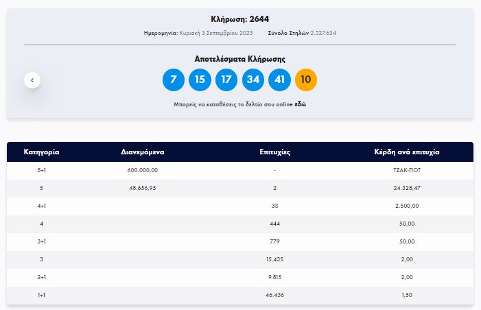 Στην κλήρωση Τζόκερ, σήμερα Κυριακή 3 Σεπτεμβρίου (αριθμός κλήρωσης 2644), τυχεροί αριθμοί ήταν οι: 7, 15, 17, 34, 41 και Τζόκερ το 10 .