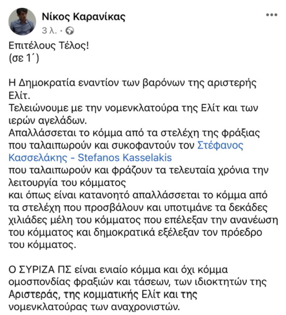 Απαλλάσσεται το κόμμα από τα στελέχη της φράξιας που ταλαιπωρούν και συκοφαντούν τον Στέφανος Κασσελάκης – Stefanos Kasselakis, που ταλαιπωρούν και φράζουν τα τελευταία χρόνια την λειτουργία του κόμματος και όπως είναι κατανοητό απαλλάσσεται το κόμμα από τα στελέχη που προσβάλουν και υποτιμάνε τα δεκάδες χιλιάδες μέλη του κόμματος που επέλεξαν την ανανέωση του κόμματος και δημοκρατικά εξέλεξαν τον πρόεδρο του κόμματ