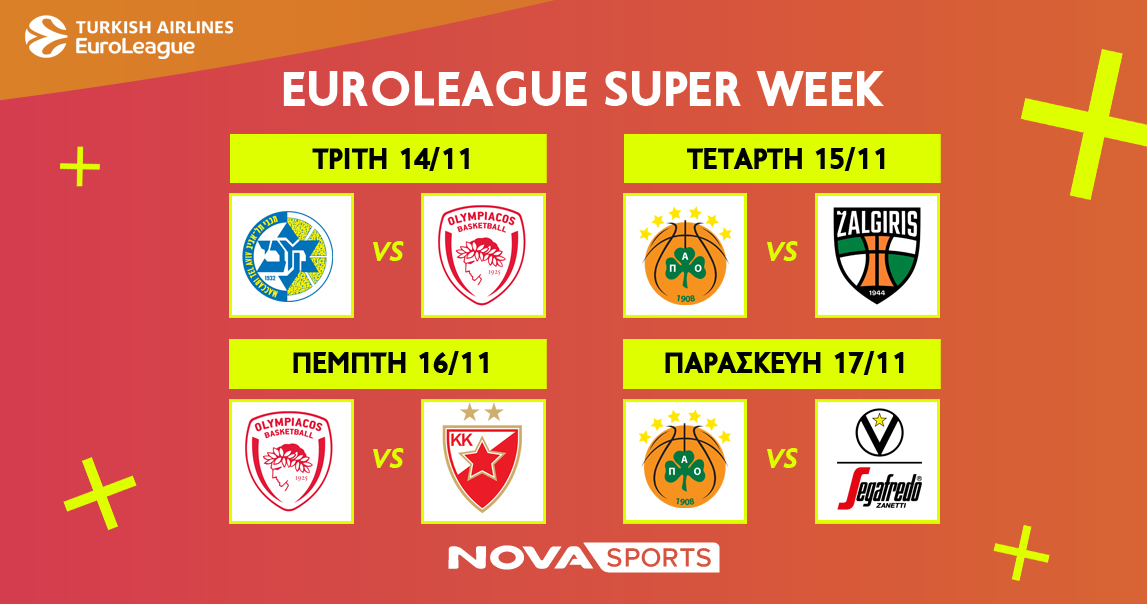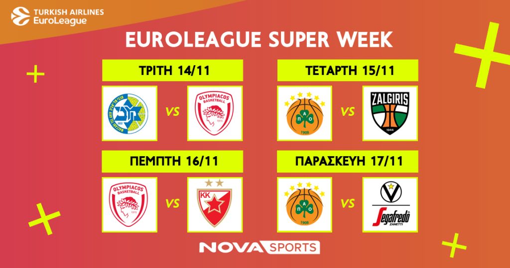 Η δεύτερη «διαβολοβδομάδα» της EuroLeague είναι εδώ και το Novasports ετοιμάζεται να καλύψει το μπασκετικό υπερθέαμα με τον αρτιότερο τρόπο! Οι φίλοι του μπάσκετ, από την Τρίτη 14 Νοεμβρίου έως και την Παρασκευή 17 Νοεμβρίου θα έχουν την ευκαιρία να απολαύσουν ζωντανά και αποκλειστικά όλους τους αγώνες για την 8η και 9η αγωνιστική της κορυφαίας ευρωπαϊκής διασυλλογικής διοργάνωσης. Το ενδιαφέρον στρέφεται στις αναμετρήσεις ελληνικού ενδιαφέροντος, Μακάμπι Τελ Αβιβ – Ολυμπιακός (14/11, 21:05), Παναθηναϊκός – Ζάλγκιρις Κάουνας (15/11, 21:15) και Ολυμπιακός – Ερυθρός Αστέρας (16/11, 21:15), Παναθηναϊκός – Βίρτους Μπολόνια (17/11, 21:15).