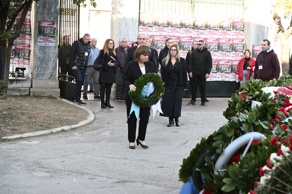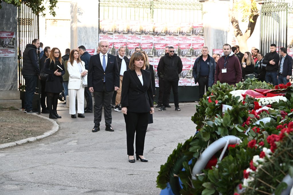 Η Κατερίνα Σακελλαροπούλου πέρασε την πύλη του Πολυτεχνείου στις 9:00, κατέθεσε το στεφάνι της και στη συνέχεια αποχώρησε.