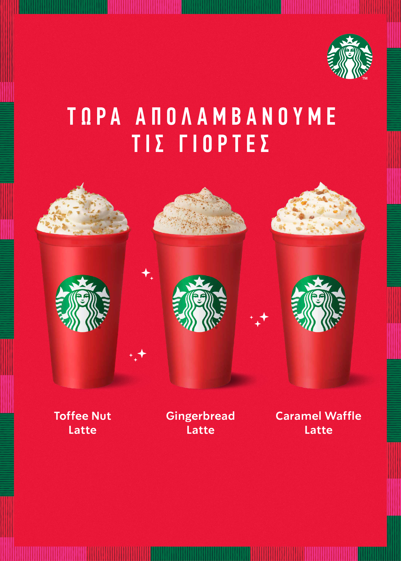 Caramel Waffle Latte: Η απόλυτη εκδοχή της αγαπημένης μας βάφλα σε ένα ακαταμάχητο ρόφημα. Εμπνευσμένο από τις αγαπημένες μας βάφλες καραμέλας, αυτό το ρόφημα αποτελεί τον πιο γλυκό μας πειρασμό τα φετινά Χριστούγεννα. Ο έντονος Espresso Roast, αναμιγνύεται με γάλα και γεύση καραμελωμένης βάφλας, δημιουργώντας το πιο εκρηκτικό γευστικό αποτέλεσμα. Γαρνίρεται με σαντιγί και κομματάκια καραμελωμένης βάφλας με μπαχαρικά, που απογειώνουν την απόλαυση. Διαθέσιμο και ως Frappuccino®.