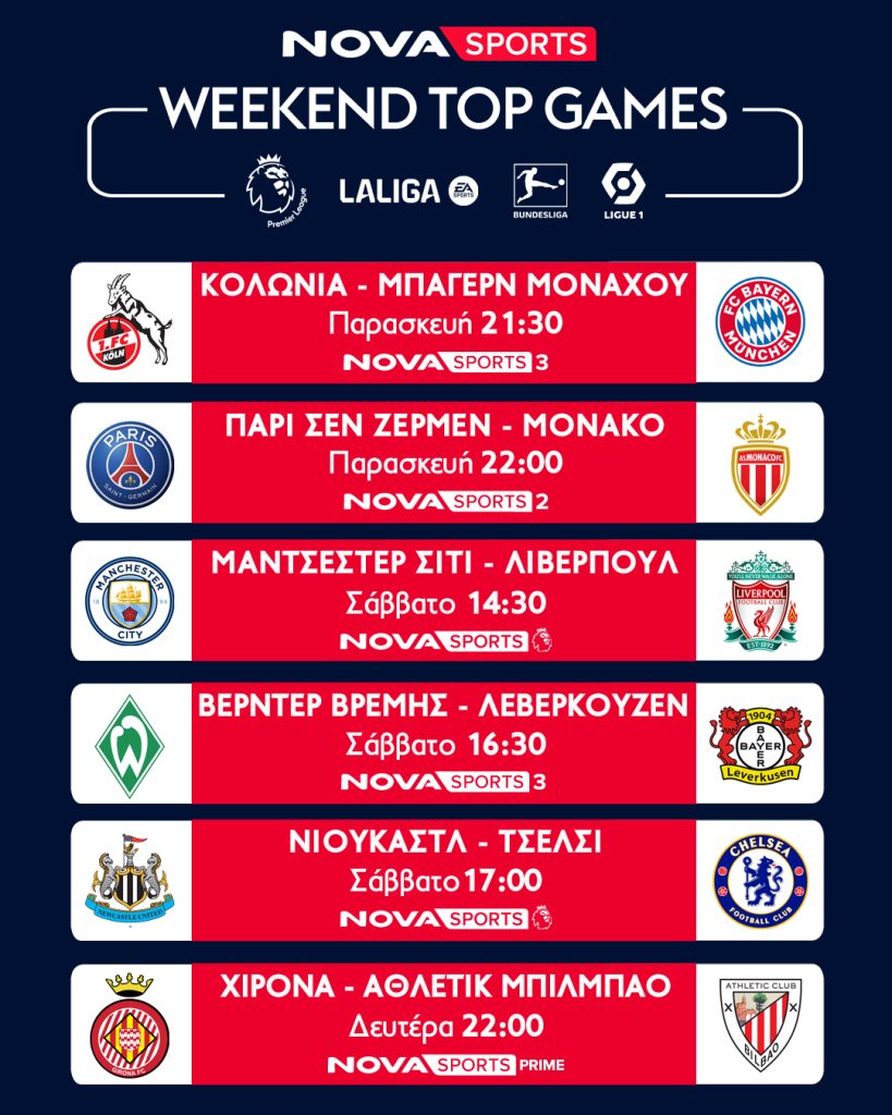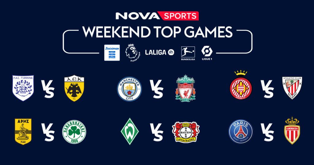Ποδοσφαιρική πανδαισία με περισσότερους από 50 LIVE συναρπαστικούς αγώνες έρχεται και αυτή την εβδομάδα αποκλειστικά στο γήπεδο του Novasports! Με τους αγώνες Άρης – Παναθηναϊκός, ΠΑΣ Γιάννινα – ΑΕΚ, ΠΑΟΚ – Πανσερραϊκός να δεσπόζουν από πλευράς ελληνικού ενδιαφέροντος, με το ντέρμπι της Premier League, Μάντσεστερ Σίτι – Λίβερπουλ, με τα ντέρμπι στη Γαλλία, Παρί Σεν Ζερμέν – Μονακό και Λιόν – Λιλ, με τις «μάχες» Κάδιθ – Ρεάλ Μαδρίτης, Βαγιεκάνο – Μπαρτσελόνα, Χιρόνα – Αθλέτικ Μπιλμπάο στη LaLiga EA Sports και Κολωνία – Μπάγερν Μονάχου στη Bundesliga!