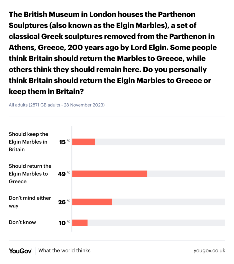 Σε άλλο αντίστοιχο ερώτημα για το ποιος θα πρέπει να λάβει την απόφαση για την επιστροφή των Γλυπτών ή όχι, η πλειονότητα των Βρετανών υποδεικνύει το Βρετανικό Μουσείο.