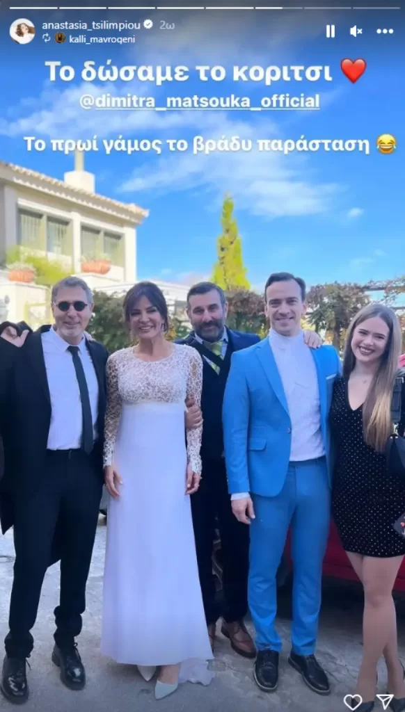 Οι συμπρωταγωνιστές της Δήμητρας Ματσούκα στο θέατρο, Θοδωρής Αθερίδης, Δημήτρης Σαμόλης , Ηλίας Βαλάσης και Αναστασία Τσιλιμπίου, φωτογραφήθηκαν με τη νύφη και ανέβασαν τα στιγμιότυπα σε Instagram stories. «Το δώσαμε το κορίτσι» γράφουν.