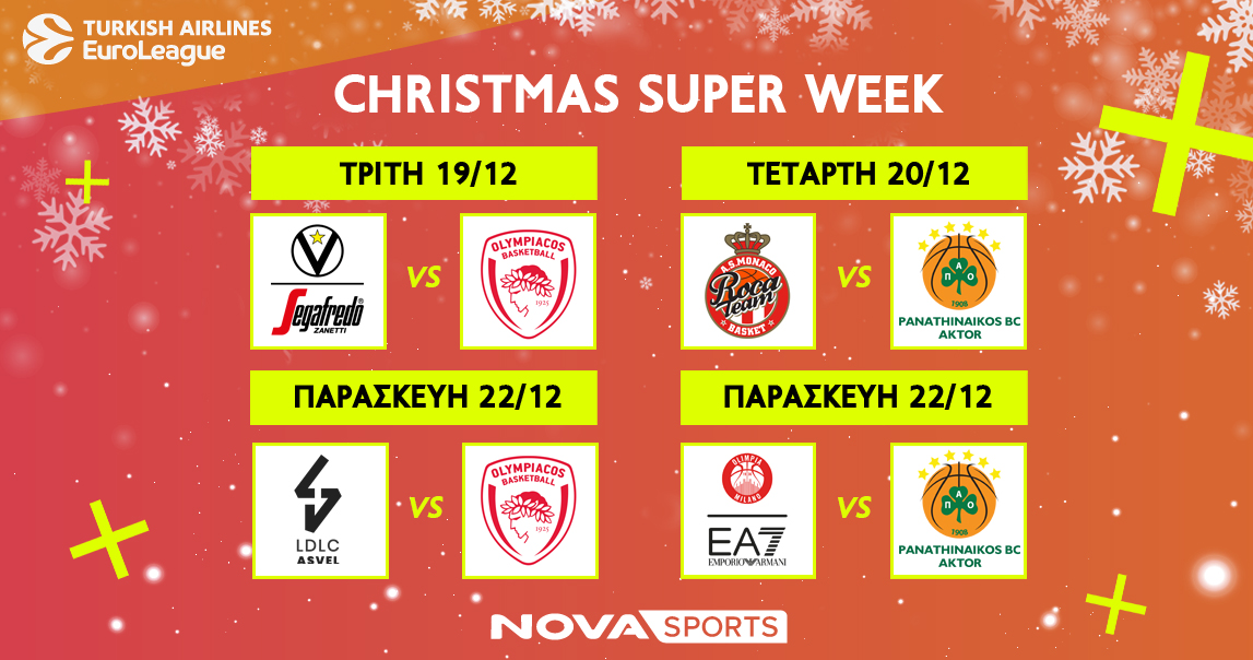 Η «διαβολοβδομάδα»…. Νο4 της EuroLeague είναι εδώ και το Novasports ετοιμάζεται να καλύψει το μπασκετικό υπερθέαμα με τον αρτιότερο τρόπο! Οι φίλοι του μπάσκετ, από την Τρίτη 19 Δεκεμβρίου έως και την Παρασκευή 22 Δεκεμβρίου θα έχουν την ευκαιρία να απολαύσουν ζωντανά και αποκλειστικά όλους τους αγώνες για την 15η και 16η αγωνιστική της κορυφαίας ευρωπαϊκής διασυλλογικής διοργάνωσης. Το ενδιαφέρον στρέφεται στις αναμετρήσεις Βίρτους Μπολόνια-Ολυμπιακός (19/12, 21:30) & Μονακό-Παναθηναϊκός AKTOR (20/12, 20:00) για την 15η αγωνιστική, καθώς και Βιλερμπάν-Ολυμπιακός (22/12, 20:45) & Αρμάνι Μιλάνο-Παναθηναϊκός AKTOR (22/12, 21:45) για την 16η αγωνιστική.