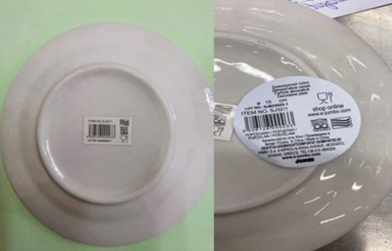 Ο ΕΦΕΤ ενημερώθηκε για τη διακίνηση στην ελληνική αγορά του συγκεκριμένου πιάτου, μέσω του Συστήματος Έγκαιρης Προειδοποίησης για τα Τρόφιμα και τις Ζωοτροφές (RASFF). Πρόκειται για πιάτο από πορσελάνη με χριστουγεννιάτικη διακόσμηση 15 cm, με κωδικό προϊόντος ITEM NO: SJ0211, αριθμό γραμμοκώδικα 0526126000033 και αριθμό παρτίδας SJB23022-1, το οποίο διακινείται από την εταιρεία «JUMBO ΑΝΩΝΥΜΗ ΕΜΠΟΡΙΚΗ ΕΤΑΙΡΕΙΑ».