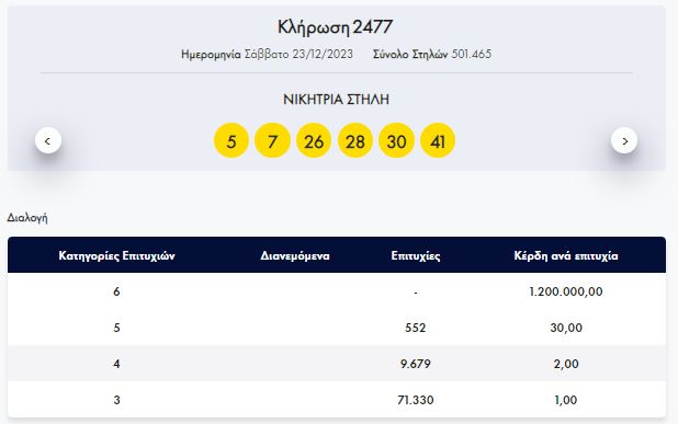 Στην κλήρωση ΛΟΤΤΟ αριθμός 2477, σήμερα Σάββατο 23/12/2023, τυχεροί αριθμοί είναι: 5, 7, 26, 28, 30, 41.