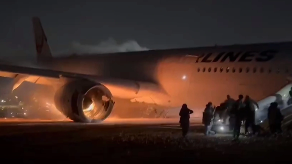 Οι εικόνες από το αεροσκάφος της Japan Airlines που τυλίχτηκε σήμερα στις φλόγες στο αεροδρόμιο του Τόκιο, το Χανέντα, έπειτα από πιθανή σύγκρουσή του με αεροσκάφος της ακτοφυλακής κάνουν το γύρο του κόσμου.