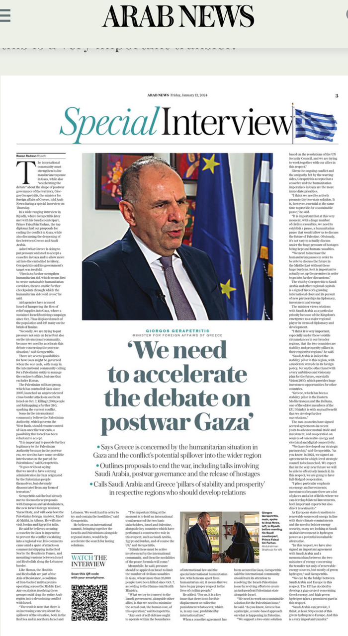Σε ερώτηση από τη Σαουδάραβα δημοσιογράφο αν υπάρχει προοπτική η Ελλάδα να αναλάβει διαμεσολάβηση και να θέσει τέλος σε αυτή τη σύγκρουση, ιδίως μιας και η Ελλάδα διατηρεί ιστορικά καλές σχέσεις και με τα δύο μέρη, το Ισραήλ και τους Παλαιστίνιους, ο κ. Γεραπετρίτης επανέλαβε πως η χώρα μας έχει υιοθετήσει σαφή θέση αρχών από την αρχή αυτής της κατάστασης και επισήμανε πως έχει αποκτήσει ισχυρό διπλωματικό κεφάλαιο. «Συνομιλούμε με όλους τους δρώντες και όλα τα μέρη. Είμαστε, θεωρώ, ιδιαιτέρως αξιόπιστοι συνομιλητές στο θέμα αυτό και προσφέρουμε καλές υπηρεσίες. Ήδη νομίζω ότι έχουμε προσφέρει διαμεσολάβηση σε σχέση με την Ευρωπαϊκή Ένωση. Υποβάλαμε ένα αρχικό σχέδιο που έγινε συνολικά αποδεκτό από την ΕΕ και ιδιαίτερα από το Συμβούλιο Εξωτερικών Υποθέσεων, σχετικά με την κατάσταση στη Μέση Ανατολή. Και τώρα νομίζω ότι είμαστε σε θέση να διαμεσολαβήσουμε με όλα τα εμπλεκόμενα μέρη».