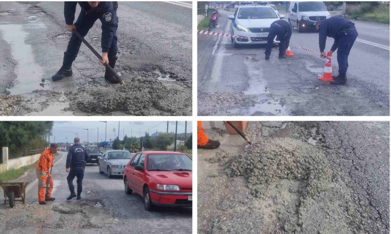 Αστυνομικοί μετά τις καταγγελίες των πολιτών βρέθηκαν στην περιοχή και αποφάσισαν να αναλάβουν δράση. Σταμάτησαν μπετονιέρα που περνούσε τυχαία και ζήτησαν από τον οδηγό να ρίξει λίγο μπετόν. Οι ίδιοι βοήθησαν παίρνοντας το φτυάρι κλείνοντας προσωρινά τις επικίνδυνες λακκούβες.