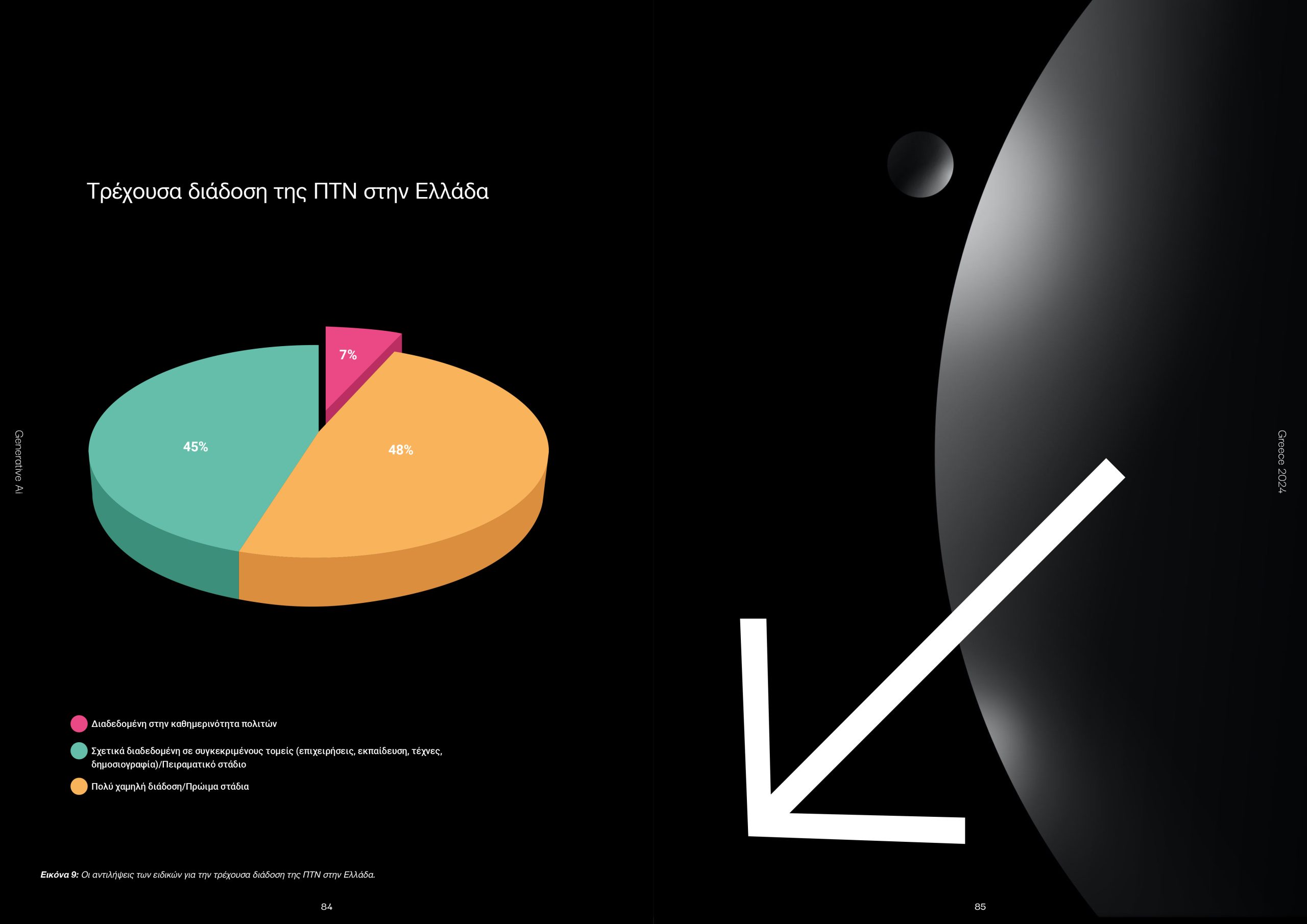 Απ.: Η έρευνα δείχνει μια εικόνα αισιοδοξίας ως προς την υιοθέτηση της ΠΤΝ σε διάφορους κλάδους της οικονομίας της χώρας. Οι ειδικοί εκτιμούν ότι ο αντίκτυπος θα είναι ιδιαίτερα υψηλός, με την ΠΤΝ να είναι ευρέως προσβάσιμη σε όλη την κοινωνία. Οι ερωτηθέντες προσβλέπουν στην ευρεία χρήση της ΠΤΝ ως μέσο έκφρασης, εργαλείο εργασίας αλλά και μοχλό ανάπτυξης. Ταυτόχρονα, επισημαίνουν την πιθανή κακή χρήση της τεχνολογίας αυτής με στόχο την παραπληροφόρηση και τη διάδοση ψευδών ειδήσεων και γεγονότων.