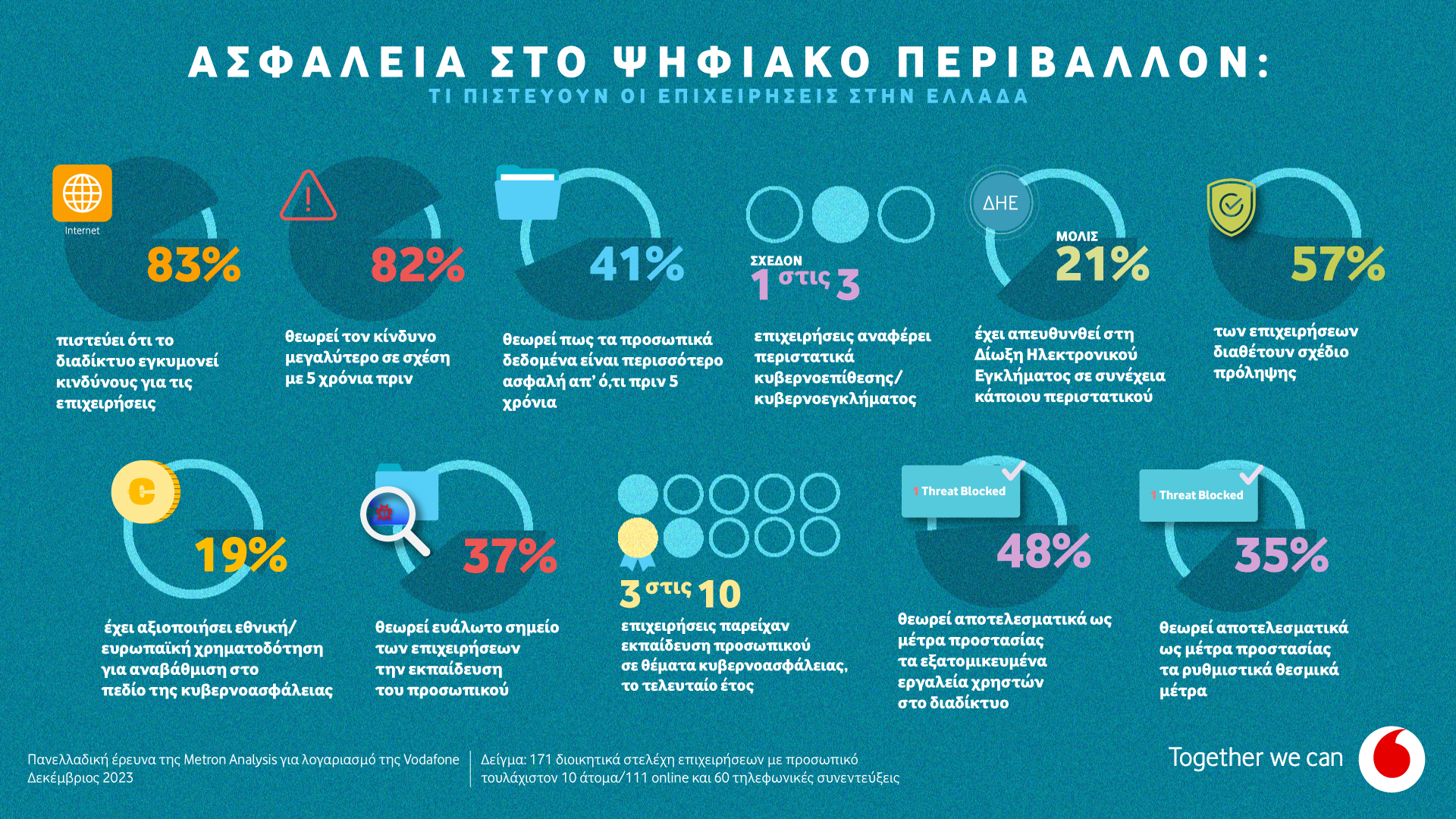 Πανελλαδική έρευνα σε επιχειρήσεις που δραστηριοποιούνται στην Ελλάδα για την ασφάλεια τους στο διαδίκτυο διενήργησε η Metron Analysis, για λογαριασμό της Vodafone Ελλάδας. Η «Έρευνα B2B για την Ασφάλεια στο Διαδίκτυο» καταγράφει την εμπειρία και τις αντιλήψεις των ελληνικών επιχειρήσεων για τις απειλές από τη χρήση του Διαδικτύου, τους βασικούς κινδύνους που αντιμετωπίζουν, καθώς και τα μέτρα προστασίας που λαμβάνουν.