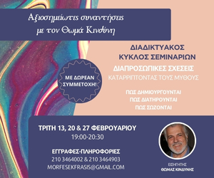 Ο Θωμάς Κινδύνης παρουσιάζει έναν νέο κύκλο διαδικτυακών σεμιναρίων που πραγματοποιείται τις Τρίτες 20 & 27 Φεβρουαρίου, με θέμα τις διαπροσωπικές σχέσεις.