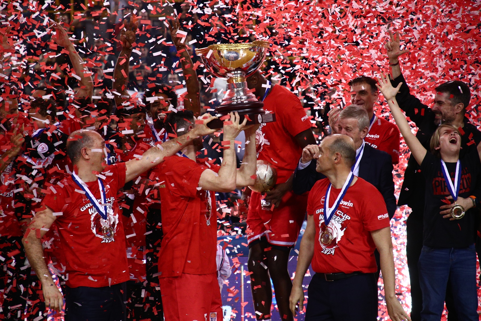 Στο… γλέντι των Πειραιωτών συμμετείχαν τόσο το τεχνικό επιτελείο των “ερυθρολεύκων”, όσο και οι πρόεδροι της ομάδας, Γιώργος και Παναγιώτης Αγγελόπουλος. Φυσικά, δεν μπορούσε να λείψει ούτε το βαρύτιμο τρόπαιο!